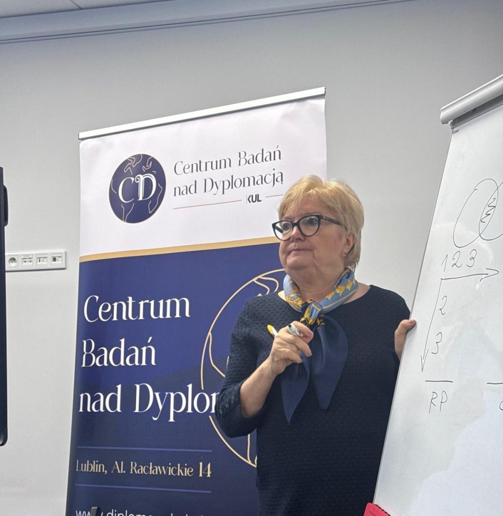Szkolenie poprowadziła Pani Bogumiła Więcław – wieloletnia pracowniczka polskiej służby zagranicznej. W Ministerstwie Spraw Zagranicznych zajmowała się m.in. przywilejami i immunitetami dyplomatycznymi oraz organizacją wizyt zagranicznych. Pracowała na placówkach w Helsinkach, Waszyngtonie i Canberze, a w latach 2003–2007 pełniła tam funkcję chargé d’affaires; w centrali MSZ kierowała także Wydziałem Przywilejów i Immunitetów Dyplomatycznych oraz była zastępczynią dyrektora Protokołu Dyplomatycznego.
